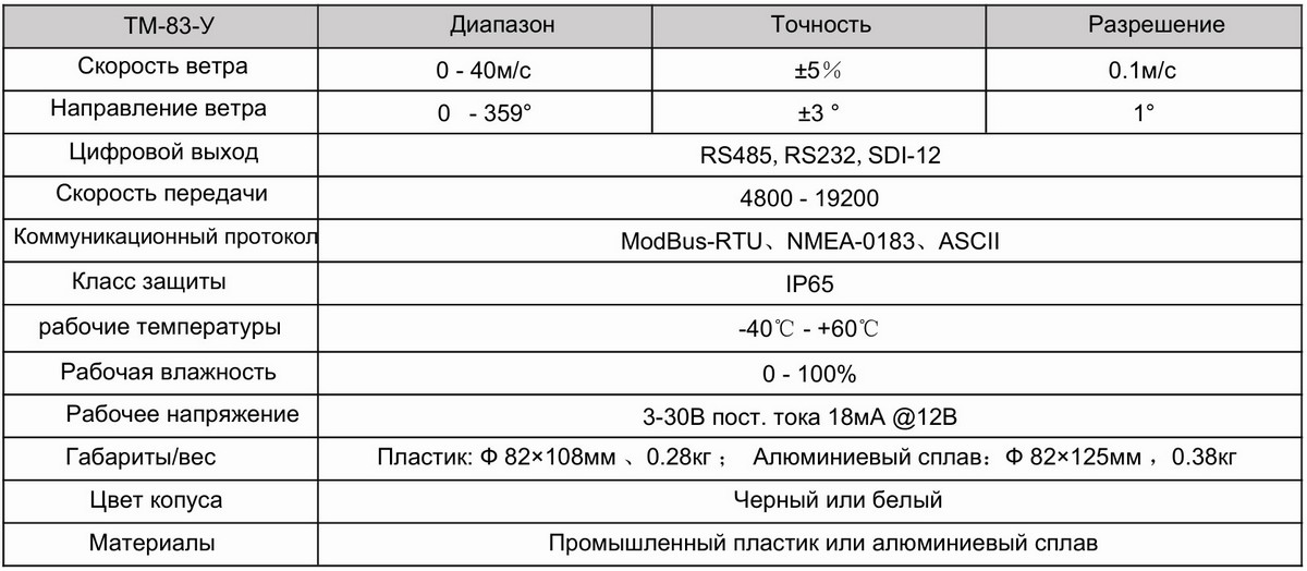 По умолчанию в изделии установлен 4-х пиновый выход, использующий сигнал RS485, но опционально датчик скорости ветра ультразвуковой ТМ-83-У может быть изготовлен под сигналы RS232 и SDI-12 или с аналоговым выходом 4-20 мА.